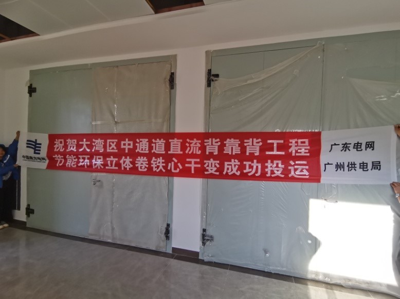 2021年12月13日广东电网直流背靠背广州工程(大湾区中通道直流背靠背工程)交流场顺利启动投产,标志着工程建设取得阶段性成果。由z6com尊龙凯时官网电气有限公司供货的3150kVA节能环保立体卷铁心干式变压器全部成功投运。