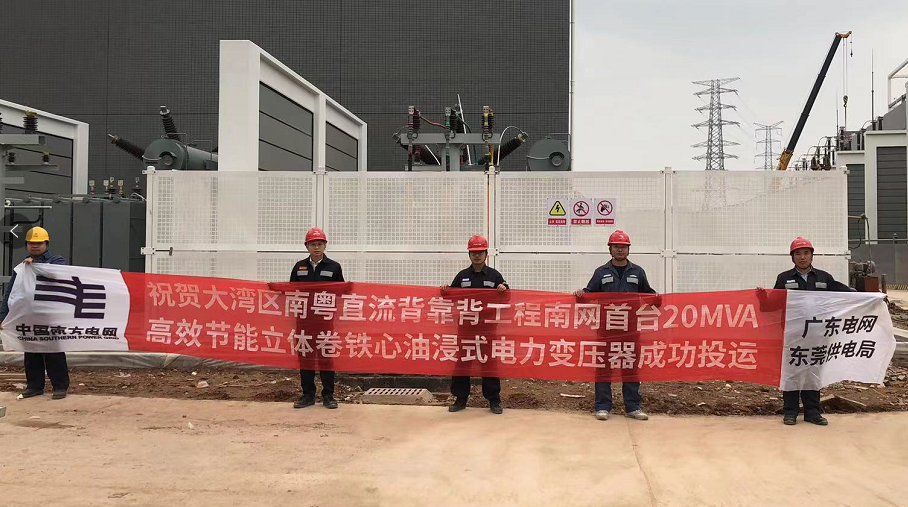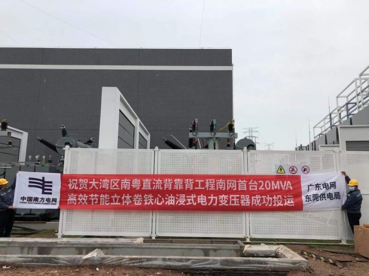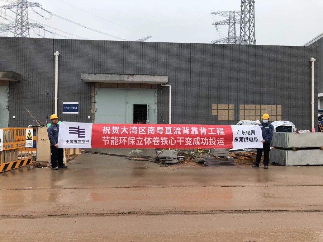 2021年12月25日广东电网直流背靠背东莞工程(大湾区南粤直流背靠背工程) 交流场首次投运,由z6com尊龙凯时官网电气有限公司供货的南网首台20MVA高效节能立体卷铁心油浸式电力变压器成功投运,计划首批通电的3150kVA节能环保立体卷铁心干式变压器也成功投运。